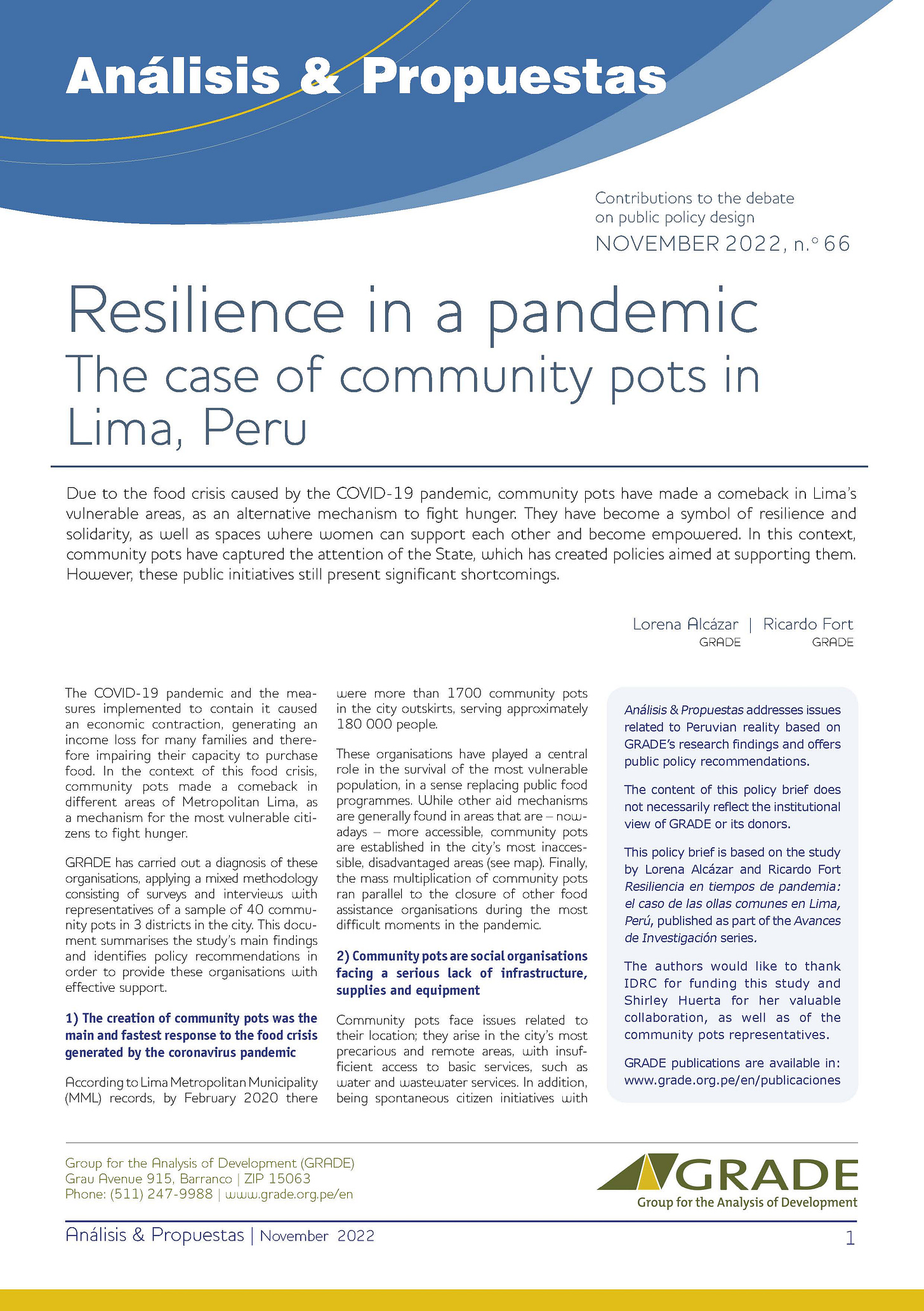 Resilience in a pandemic: the case of community pots in Lima, Peru. Análisis & Propuestas 66. Por: Lorena Alcázar y Ricardo Fort.