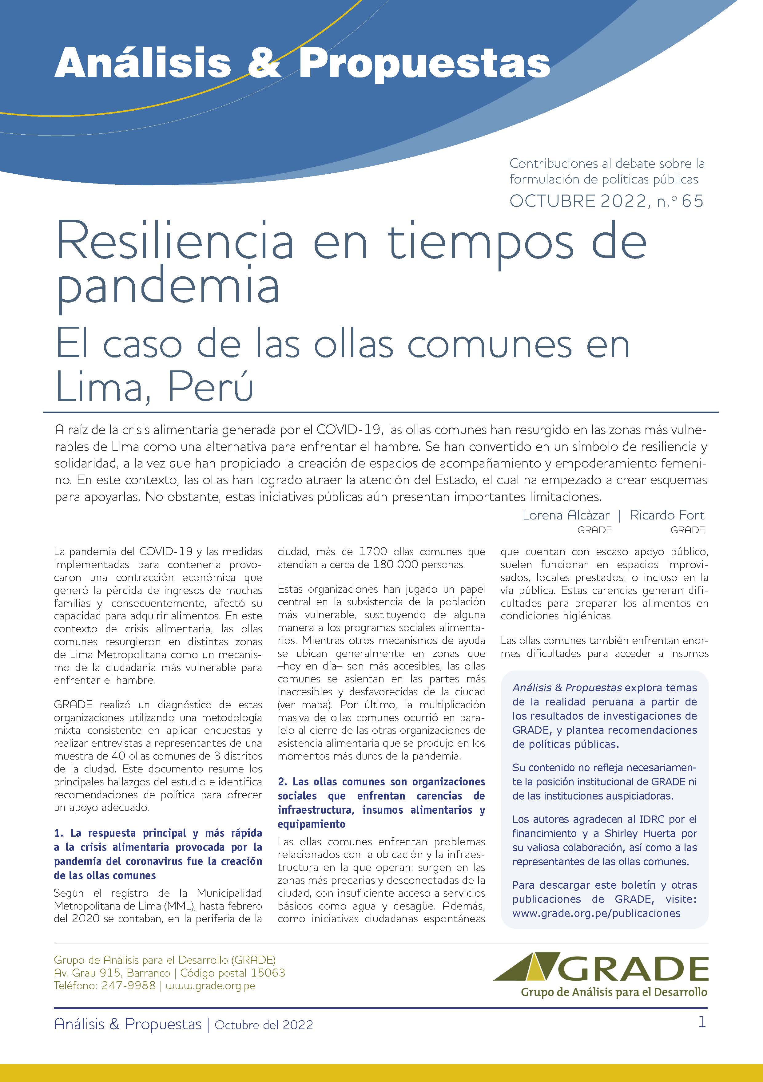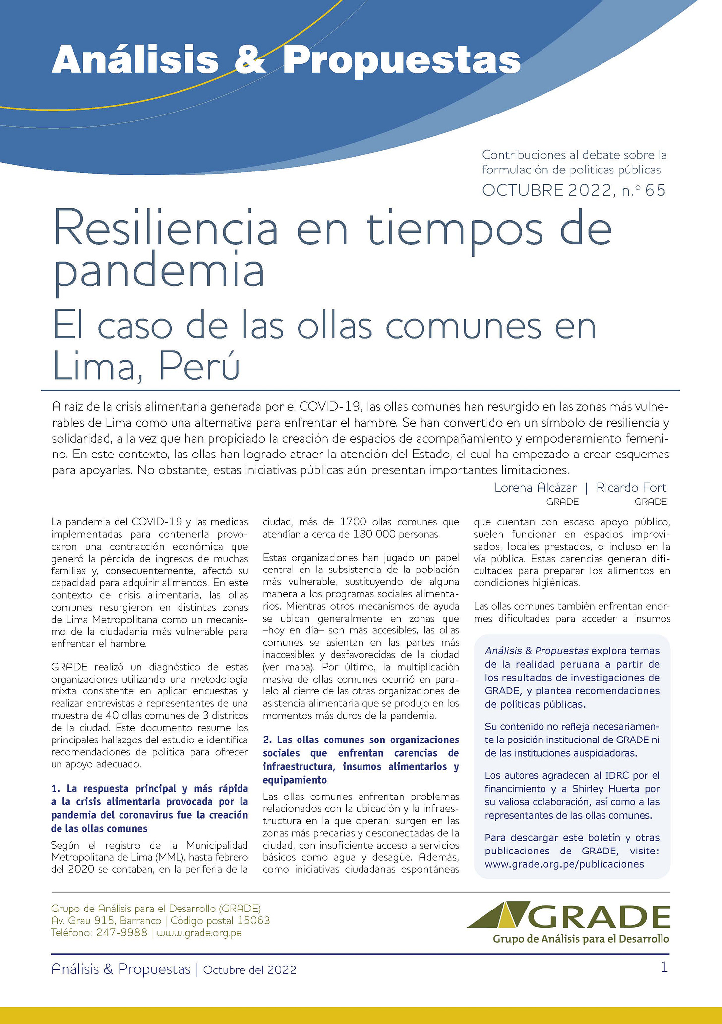 Resiliencia en tiempos de pandemia: el caso de las ollas comunes en Lima, Perú. Análisis & Propuestas 65. Por: Lorena Alcázar y Ricardo Fort.